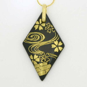 ペンダント 黒塗金彩花いかだ(菱形)桜の花が水面に美しく漂う風景を描きました。【窯名】善昇【材質】磁器【サイズ】トップ:縦5×横3cm チェーン 60cm紙箱ご自分用だけでなく、お返し、贈答品、贈答、プレゼントなど贈り物ギ