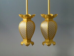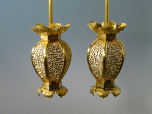 隠元灯籠とよばれています、ちょっと縦長の釣り灯籠です。 銅製生地に本金消しメッキ仕上げ。 このサイズですと、台付き小型のほとんどの仏壇に適します。 一対(2つ一組)の価格です。(電装器具は別売り) 電球の交換は写真のように火袋部分を