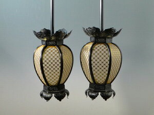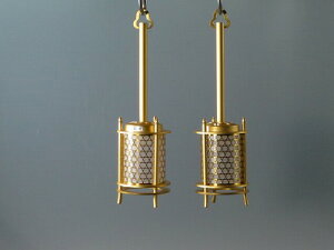 隠元灯籠とよばれています、ちょっと縦長の釣り灯籠です。 真鍮製生地に本金消しメッキ仕上げ。このサイズですと、台付き小型のほとんどの仏壇に適します。 一対(2つ一組)の価格です。(電装器具は別売り) 電球の交換は写真のように