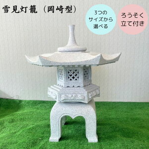 商品仕様 サイズ 画像参照ください。 材質 本体:御影石 ろうそく立て:ステンレス 色 画像参照ください。 商品説明 雪見灯籠岡崎型です。 和風の庭園にピッタリです。 サイズは3種類ご用意しております...