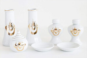 国産「せともの」陶器製の神具7点セット。 お稲荷専用の美しい金文字・稲荷紋付き。 お祀りに必要な榊立、平次、水玉、皿、がすべて揃っています。 稲荷宮の神棚をお祀りする為の神具はこれで揃います。 何を買