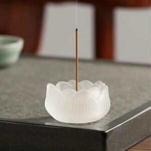 瑠璃製の蓮の花形お香立てです。熟練の職人が一つ一つ手作りで仕上げた本品は、透明な瑠璃素材が持つ清涼感と、蓮の花