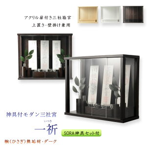 ◆美しい銘木を活かし、シンプルに造り上げた 仏縁堂モダンデザインの三社箱宮 箱から出してすぐにお祀りできる 便利な神具セット付モダン神棚です 神棚の奥行は約18cmの省スペース設計 棚やテーブル、チェストの上に上置きとして...