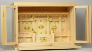正面がガラス開き戸の箱型の神棚。神殿が埃や塵になりにくく、少しの神具なら外扉の中に納める事ができます。 [外寸(最大部)] ・高390×巾540×奥行260ミリ ※前引きは約14センチ前に出ます。