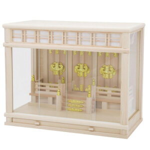 ■箱宮 ガラス宮18号■ ■神棚主要材:檜葉(ヒバ) ■神棚外寸:39(高)-55(巾)-32.5(奥)センチ 三社タイプの箱宮神棚です。 御神札は扉枠を外してお納めするため簡単にお納めできます。