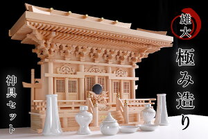 商品詳細 神々を壮大に祀る 彫刻をちりばめた、神棚 風神雷神と双龍の彫刻、天界の神々をイメージした美しく壮大なお社です。桧ではなく、年輪・木目がほとんど無い淡い単色のヒバ材で作られたお社。清楚で上品、工芸品のような趣き...