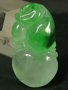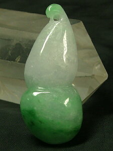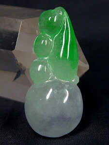 サイズ:46×29×厚13mm 重さ:30.9g こちらは透明感の有る氷種のミャンマー翡翠です。縁起柄の瓢箪が彫り込まれています。上部に貫通穴が有ります。ペンダントトップや下げ飾り等に。