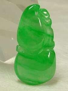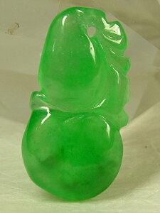 サイズ:30×14×厚6mm 重さ:4g 緑色が綺麗なミャンマー翡翠。こちらはかなり透明感の有る「氷種」です。縁起柄の瓢箪が彫り込まれています。上部に貫通穴が有ります。ペンダントトップや下げ飾り等に。