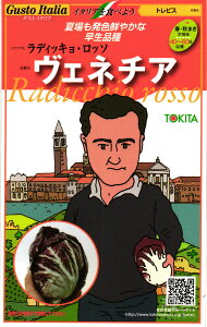 グストイタリアシリーズ 夏場も発色鮮やかな早生品種【特長】赤ラディッキョは、チコリの品種群で、みな葉脈が白く葉身が赤紫色で食べるとほろ苦い味が特徴。丸形をしたキオッジャ系と呼ばれるものは、アドリア海に面したキオッジャ市