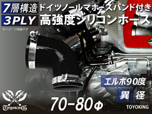 内径:70/80Φ(mm) 片足長さ:90mm 肉厚:約4.5mm 許容差:±0.5mm 構造:3プライ 7層構造 取付範囲:内径±1〜2mm程度 耐熱温度:約−50℃〜+200℃ ホースバンド個数:2個 バンド材質:SUS430 ハ...