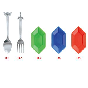 ハイラルの紋章がデザインされたフォークとスプーンと、 ルピーをモチーフにしたデザインの陶磁器製の小皿、計5種からお好きなものを選べます。 ■全5種 ■サイズ: スプーン