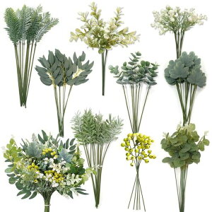 人工葉 茎付き 人工ユーカリ 造花 人工観葉植物 48個、8種類 結婚式ブーケ装飾 インテリアグリーン (グリーン 葉) 48ピースの茎付き人工葉(花瓶なし)、暖かい注意事項:葉の上の白い粉はほこりではなく...