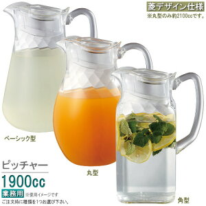 軽くて丈夫で割れにくい! プラスチック製の業務用ピッチャー。 容量(約):1.9リットル※丸型は2100ccです。 ●容器本体はMS樹脂製で、ガラス容器と比べると軽くて扱いやすいです。 ●ガラス製と比べると、落とした時に怪我の心配が少ない