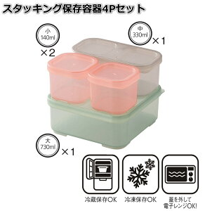 食品の種類や量に応じて使い分けられる、便利な4個セットのスタッキング保存容器です。サイズは大・中・小の3種類(小は2個)で構成されており、用途に合わせて柔軟に対応可能