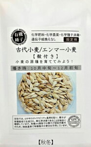 古くから続く小麦の原種。 殻が固く、農薬なしでも栽培しやすい小麦です。 まき方: 畝に10cm間隔で3〜4cmの深さの穴を掘り、2〜3粒ずつ筋まきし軽く土をかぶせる。 育て方: 種まきからおよそ1ヶ月後、葉が4枚ほどになったら麦踏みする。