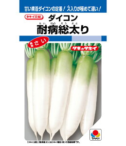 ウイルス病、萎黄病に耐病性の青首総太りだいこん。葉の茂りはやや旺盛ながら、立性なので密植ができる。肌はなめらかでツヤがあり、肉質も最高。早太りで、秋の早まき栽培では播種後55日で収穫ができ、根長36cm、根径7〜8cmとなって、ス入り...