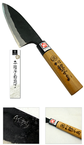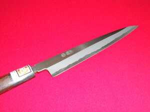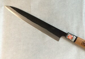 鹿児島県指定伝統的工芸品 黒打ち両刃刺身包丁大 刃渡20cm 刃部:鉄・鋼(白紙) 柄部:朴の木のロウ引き 紙化粧箱入り 純手打ち