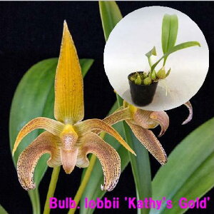 バルボフィラム属 ロビー’ キャシーズ ゴールド’ 原産国:タイ、マレー、スマトラ、ボルネオなどに原生する着生種。 花の幅7cm内外、1花茎に1花を着ける。 微風でもリップが揺れ昆虫を誘う、別名「ユリカゴン」。 この個体はアメリカ蘭