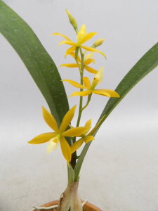 エランギス属ヒルデブランディー 2号素焼鉢 コモロ諸島原産の多年草。 花の大きさは5mmほど。 長く下垂する花茎に黄色〜オレンジ色の小花をたくさんつける。 花期は春。 1の写真は花見本です。