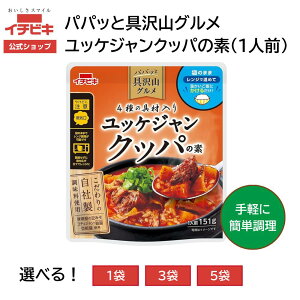 パパッと具沢山グルメユッケジャンクッパの素(1人前) ●袋のまま電子レンジで温めて、ごはんにかけるだけで簡単に食べられます。 ●イチビキこだわりの八丁みそ・コチュジャン・豆板醤・蝦醤(シャージャン)を使用し...