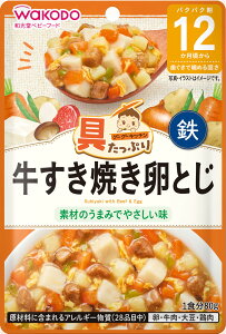 バラエティ豊かな「具」がたっぷり ・離乳食で不足しがちな鉄もしくはカルシウムを強化 ・ふんわりやわらかく練った牛肉と野菜を、お米と一緒に和風だしで煮込んだすき焼き風ごはんです。 ・着色料、香料