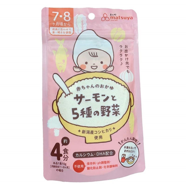 まつやのおかゆ サーモンと5種の野菜。原材料名うるち米(国産)、サーモン、たまねぎ、にんじん、ブロッコリー、レタス、白菜、たら、だし(デキストリン、鰹エキス、昆布エキス、椎茸エキス、サトウキビ繊維)、塩...