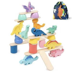 【恐竜のバランス積み木】恐竜をテーマにした子供向けの積み木です。漫画のスタイルを取り入れており、各動物のイメージは可愛く描かれています。カラフルなブロックと異なる長さの木棒を使用しており、子供たちは自由に組み立てたり