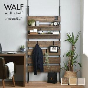 商品スペック一覧 商品名 WALF(ウォルフ)ウォールシェルフ(80cm幅) 商品サイズ W80cm×D24.5cm×H196〜254cm(パイプ中央取付D30cm) 素材 [背板・棚板]プリント紙繊維化粧板[脚部・フック]スチール(...