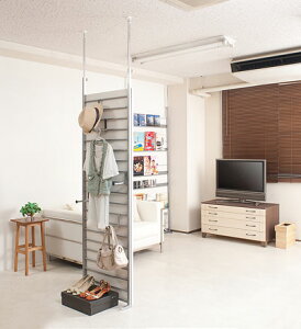 天井にポールを突っ張らせることで部屋の仕切りや、小物を掛けるのに使用できる伸縮間仕切りです。 メッシュパネルをポールの内側に取り付けているので、デザインもスッキリ♪ 小物をパネルの両面に掛けやすくなっています...