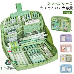 【自立ペンケース】【手帳が入る大容量】【4color】文房具を立たせて収納するので、中身が一覧しやすく、机上で省スペースに使えます。ぐるっと大きく開いて、いるものが見つけやすい。小さな小物も見失わないメッシュポケット付き。持