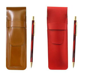 牛革ペンケースと手帳用ボールペン(赤柄)のセット ペンケース(茶色) 材質:牛革 サイズ:155mm×50mm×15mm ペン サイズ:全長125mm×軸径6mm ペンケース:OPP袋入り ペン:OPP袋入り