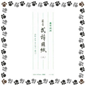 式辞用紙 大 罫入り シシ-15サイズ W105×H280mm 内容 用紙(250×1470mm)1枚 (250×780mm)1枚 多当紙(100×275mm)2枚 奉書・大礼紙各1枚 特徴 慶弔両用の罫線入り式辞用紙です。メーカー希...