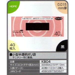 商品名小型黒色ポリ袋品番KB04サイズ (タテ×ヨコ×厚みmm)300×350×0.015(マチ110mm)入り数 (ケース)40枚×10コ×12箱入(4800枚)素材HDPE色黒特長サニタリー用の最適。JANコード458028732...