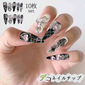 【商品仕様】 商品名: ゴシック ネイルチップ 10枚セット このゴシックスタイルの3Dネイルチップ10個セットは、個性的なデザインを求める方に最適です。 ハート型のモチーフや手錠などの特徴的な装飾が施されており、ネイルアートに深み