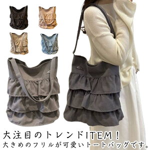 大注目のトレンドITEM!大きめのフリルが可愛いトートバッグです。バッグ全体にあしらったボリュームのあるフリルが、コーディネートを華やかに仕上げます。柔らかな素材と立体的なティアードフリルが、優美でロマンティックなムードを