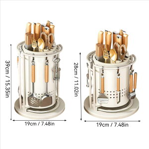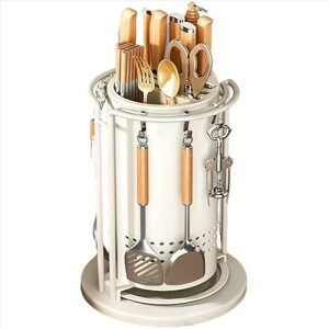 【360度回転で使いやすい】 回転可能なデザインにより、どの角度からでもスムーズに包丁やキッチンツールを取り出せます。毎日の料理をもっと快適に。【フック付きで多機能収納】 複数のフックを備え、おたま、フライ返し、菜箸、フル