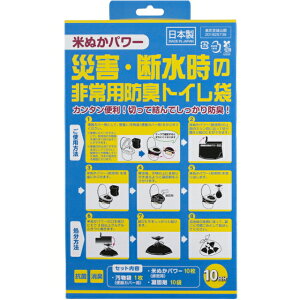 商品名 災害・断水時の非常用防臭トイレ袋 10回分 商品特徴 もしものときに備えておけば安心! 災害・断水時で水や電気がなくてもトイレが使えます。 すぐに固まる凝固剤、米ぬかパワーの抗菌・消臭力で排泄後の処理も安心です。 袋の口