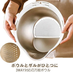 ・ボウルとザルがひとつに3WAY対応の万能ボウル ・傾斜した底面を使い分けることで、米とぎの「洗う」「さらす」「水を切る」の作業が楽にできる優れもの。 ・ボウルの側面の一部に細かな穴がついており...