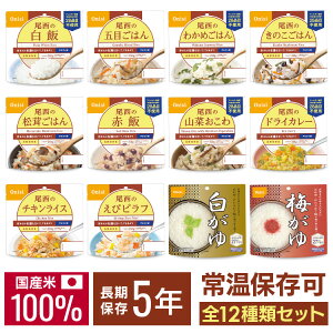 お湯や水を注いでできあがる非常時にも心強い尾西のアルファ米!●セット内容 チキンライス×1 白飯×1 五目ご飯×1 白がゆ×1 赤飯×1 きのこごはん×1(※田舎ごはんより名称変更となりました。リニューアル切り替え時期のため、きのこご...