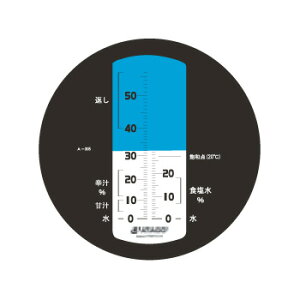 そば、うどん専用目盛を持った濃度計 です。食塩水、返し、辛汁、甘汁の目 盛が表示されます。 【測定範囲】 汁濃度0.0〜56.0% 食塩水濃度0.0〜28.0% 【最小目盛】 汁濃度1.0% 食塩水濃度1.0% 【外寸】 33×33×...