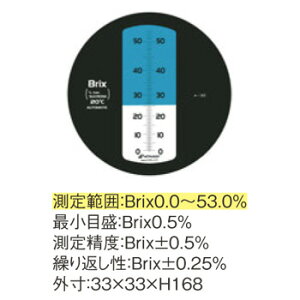 Brix0〜53%という広い測定範囲を 持つモデルです。 梅干し漬け込み時 の果肉の含水量測定などに。 また混濁しているサンプルの測定などにも他のモデルに比べ有利です。 【測定範囲】 Brix0.0〜53.0% 【最小目盛】 Brix...