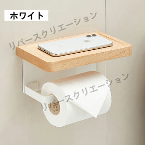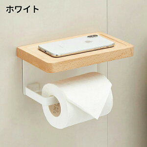【送料無料】トイレットペーパーホルダー 紙巻器 小物置き/スマホ置き 汚れに強い天板付き 棚付き 取り付け簡単 壁掛け 穴あけ不要 貼り付け 横から簡単取り替え 天然木 おしゃれ 浴室 耐荷重約5kg ホワイトフック...