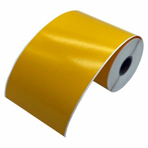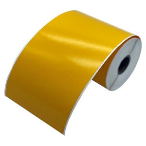 明熱転写用耐候性ビニルラベル(再剥離/黄色)。サイズ:幅102mm無定長、30m巻、外径92mm、紙管サイズ38.1mm。入数:1巻入り。性能・特性:屋外耐候性、高柔軟性、耐薬品性、再剥離