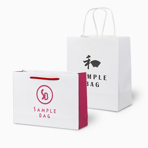 縦長で、おしゃれなサイズ・白色でカジュアルな紙袋におすすめの材質・ニス加工で表面を傷から守る・手提げ部分に厚紙が入っているので、通常の紙袋より強度が高い!