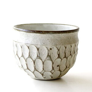 重ね彫り 連続する丸い彫り模様 大小、重ねて掘ってあるので 面白い模様になっています 粉引きの素朴な風合い 鉄分の多い黒土の ざらっとした感触の湯呑です ちょっぴり大きめのサイズなので たっぷりお茶を楽しみたい方はもちろん カフ