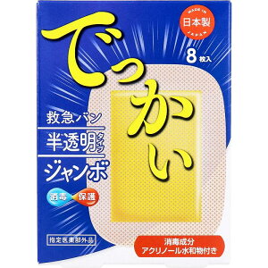 商品名 デルガード救急バン 半透明タイプ ジャンボ 8枚入 商品説明 大きな傷に! 傷口を消毒・保護する救急絆創膏です! ●アクリノール水和物含有。 ●ジャンボサイズ68mmX90mm(
