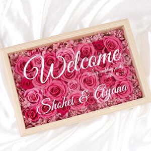 【フラワーボックスのウェルカムボード】 point1,パッと目を惹く名入れ×花 プリザーブドフラワーを同系色で揃え、 文字が引き立つようにデザインしたパッと目を惹くウェルカムボード。 結婚式や結婚パーティーのウェルカムスペ