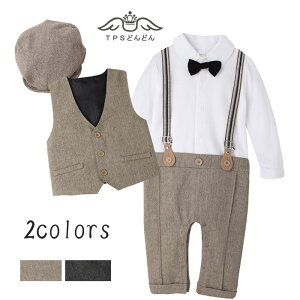 ロンパース 長袖 4点セット タキシード風 蝶ネクタイ サスペンダー 連体服 百日祝い/七五三/結婚式/お出かけ/お食い初め