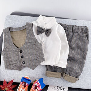 子供服 フォーマル 男の子 セットアップ 夏服 半袖 シャツ リボン ベスト 飾り 長ズボン ストライプ柄 3colors 黒 灰色 白 80/90/100/110cm フォーマルスーツ 結婚式 通学