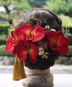 ●商品説明 成人式に合わせたタッセル付きの赤い胡蝶蘭の髪飾りです。胡蝶蘭にかすみ草 金糸手毬 水引やプリザーブドフラワーの小花を合わせた華やかで美しい髪飾りになります。 お花にはワイヤーが付いていますのでどんなヘアにも自在